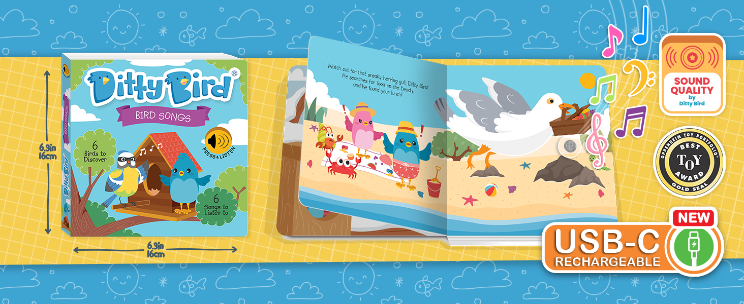 Let Ditty Bird introduce your child to the magical symphony of bird songs with the Bird Songs interactive musical book! Explore the calls of the Cuckoo, Herring gull, and more, while enjoying the timeless rhyme "Once I Saw A Little Bird," creating cherished moments of discovery and joy for the whole family.