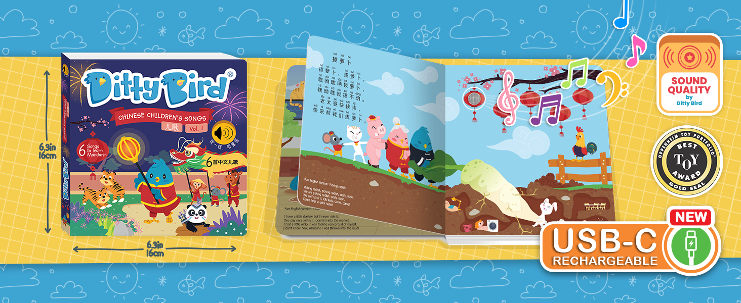Ignite your child's curiosity and love for languages with Ditty Bird’s Chinese Children’s Song in Mandarin sound book! Featuring 6 favorite Chinese songs, it's the perfect blend of fun and education, providing a playful way for kids to immerse themselves in the beauty of Mandarin through music.