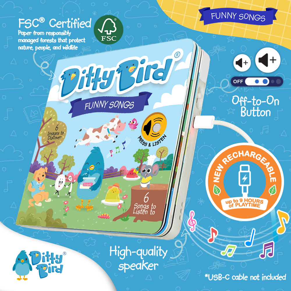 “We love Ditty Bird Books. My son - 1.5 knows how to turn them on and off on his own. He can get an hour (if not more) of entertainment out of these books. Great for when mom or dad need a second. Cute pictures, and great songs. Lyrics included on each page.” - April Smith