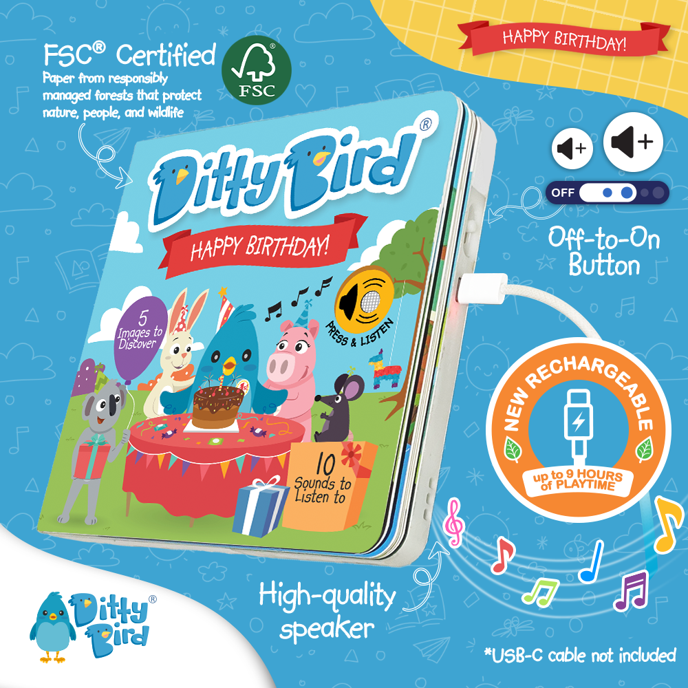 Make your child's birthday extra special with Ditty Bird's Happy Birthday musical book! From the cheerful "Happy Birthday to You" song to the sound of blowing candles, this interactive book brings the excitement of a birthday celebration to life with 10 'sound dots' to explore.