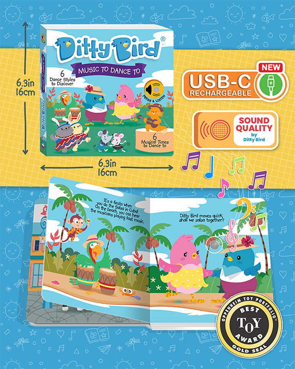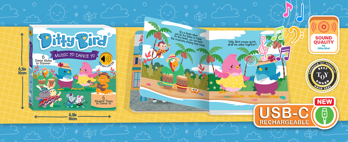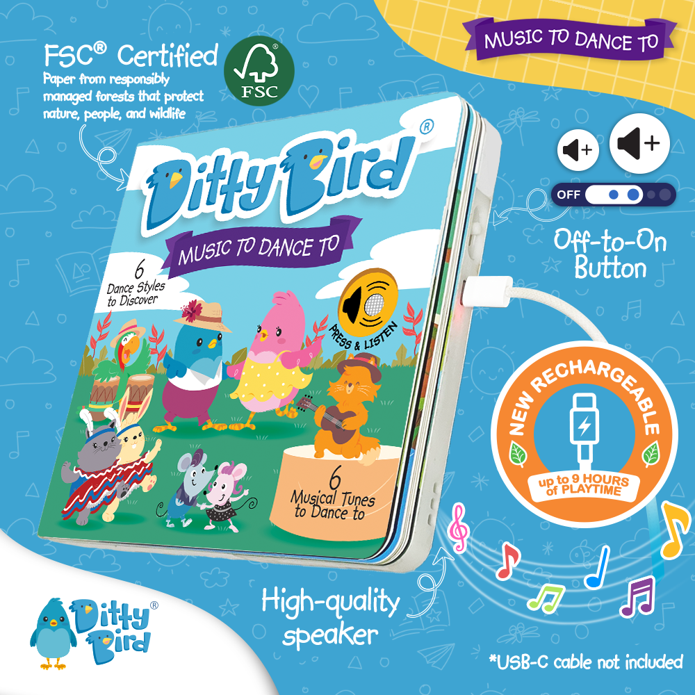 Get ready to groove around the globe with Ditty Bird's Music to Dance To musical book! From the passionate steps of the Argentinian Tango to the lively beats of Rock n' Roll, ignite your child's love for music and movement with six vibrant tunes from different corners of the world.