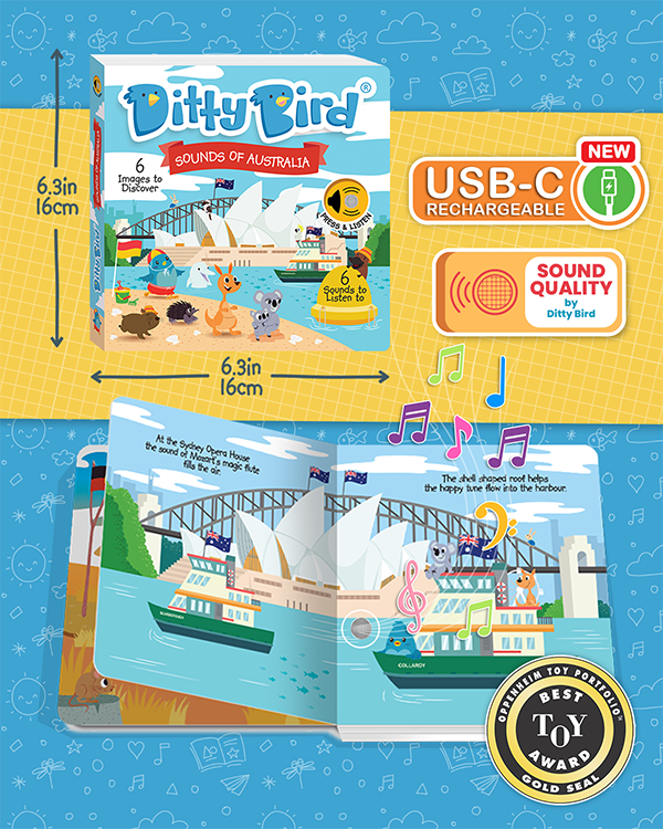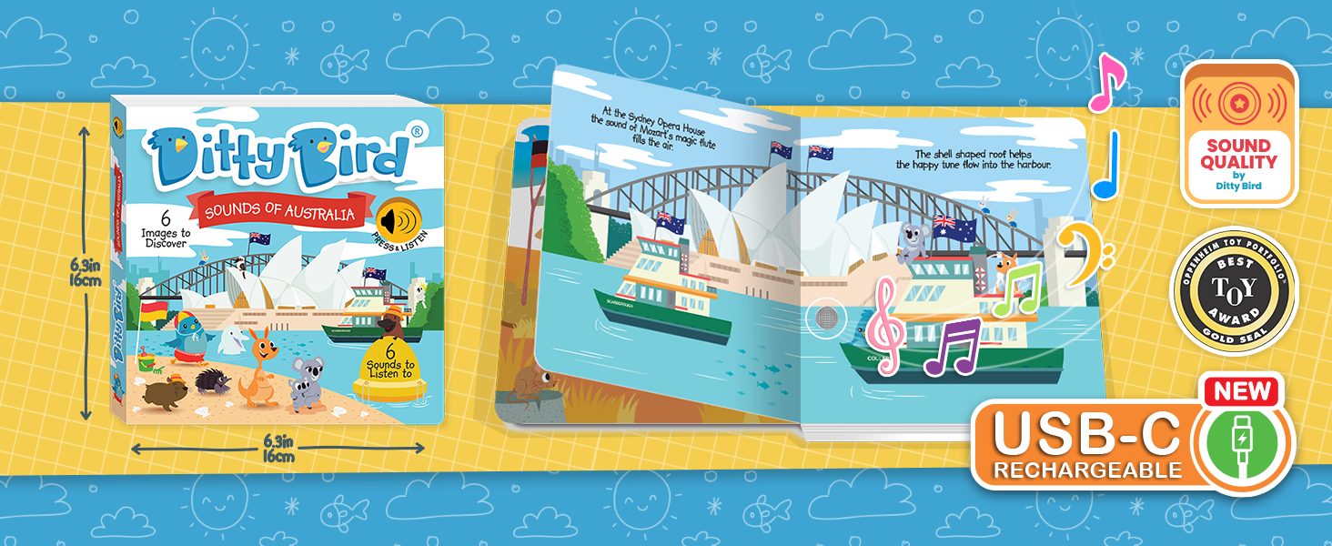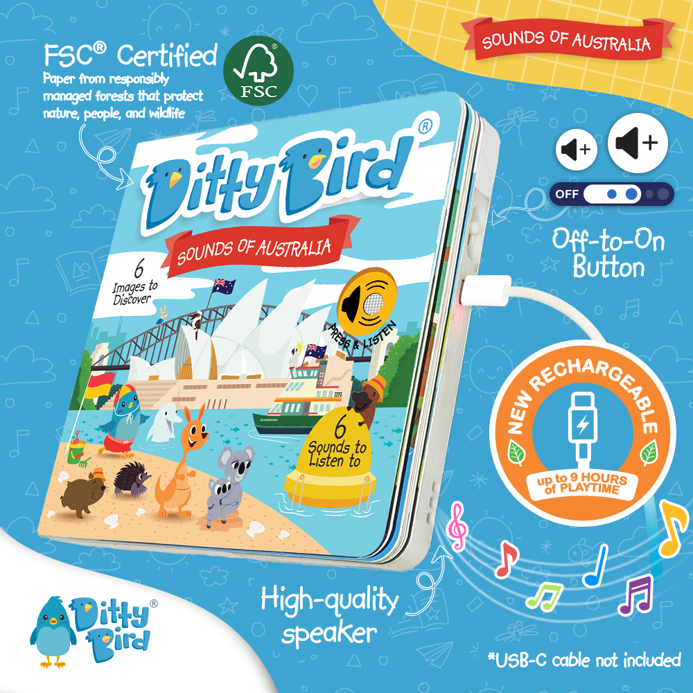 Join Ditty Bird on an exciting adventure through the Land Down Under with Ditty Bird’s Sounds of Australia interactive sound book! Your child will sing, clap, and wiggle along as they discover the wonders of Australia's beautiful landscapes and amazing wildlife, from playful wallabies and cuddly koalas to laughing kookaburras and adorable wombats.