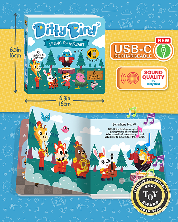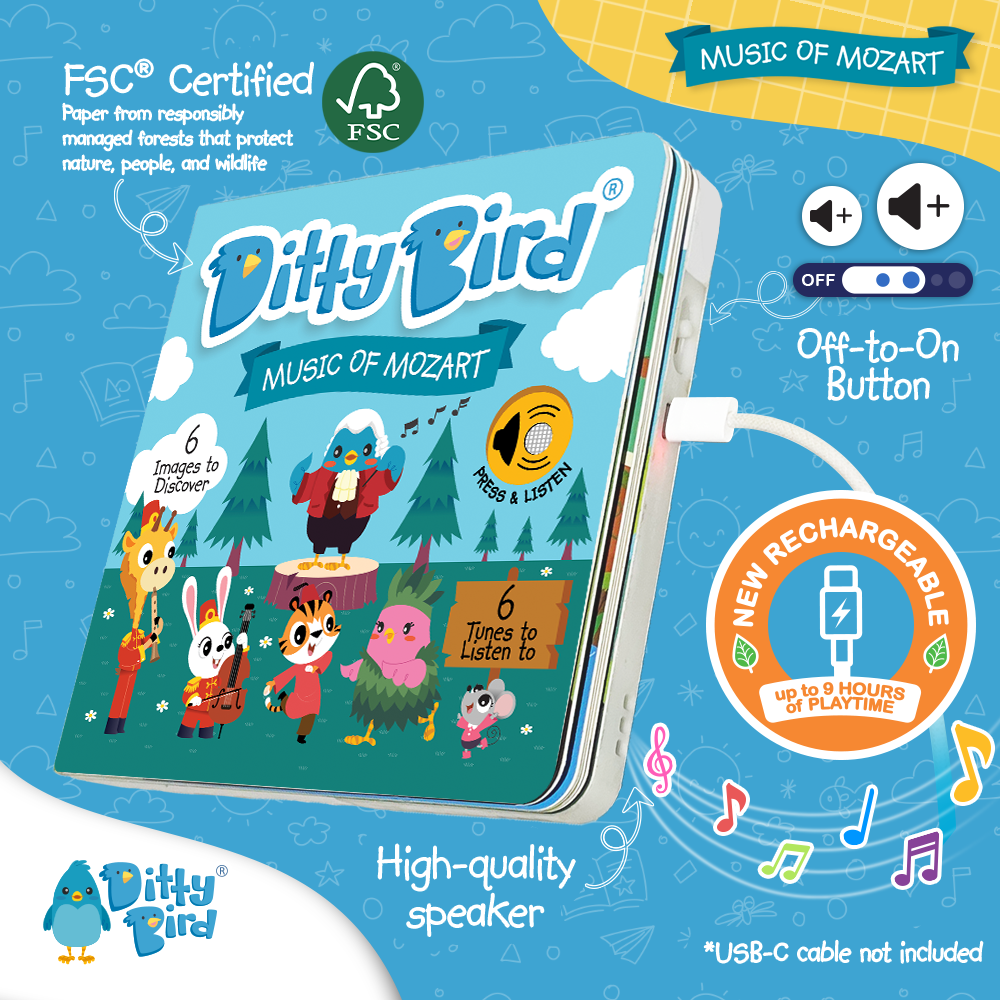 “We love Ditty Bird Books. My son - 1.5 knows how to turn them on and off on his own. He can get an hour (if not more) of entertainment out of these books. Great for when mom or dad need a second. Cute pictures, and great songs. Lyrics included on each page.” - April Smith