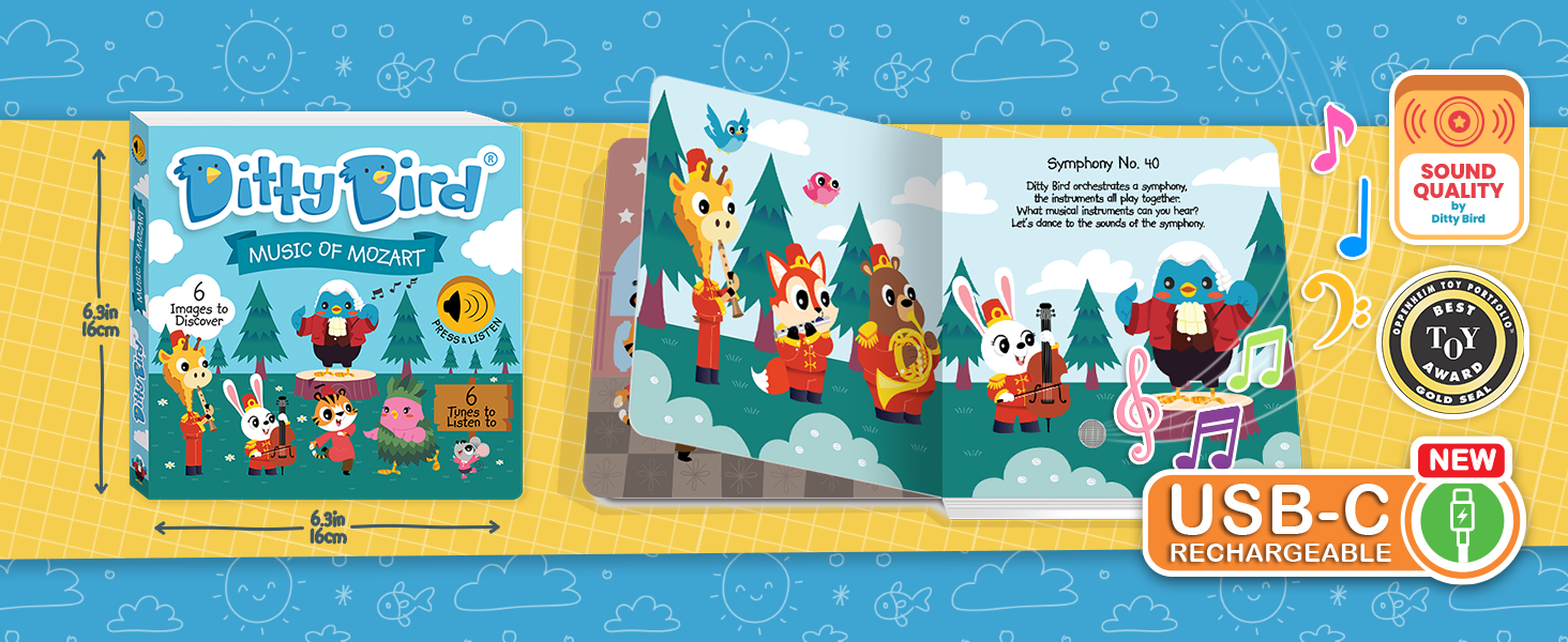 Immerse your child in the enchanting melodies of Mozart with this captivating musical book! Equipped with an innovative 'sound dot' on every page, this interactive experience invites even the youngest listeners to discover the magic of classical music in a playful and engaging manner.